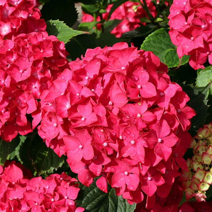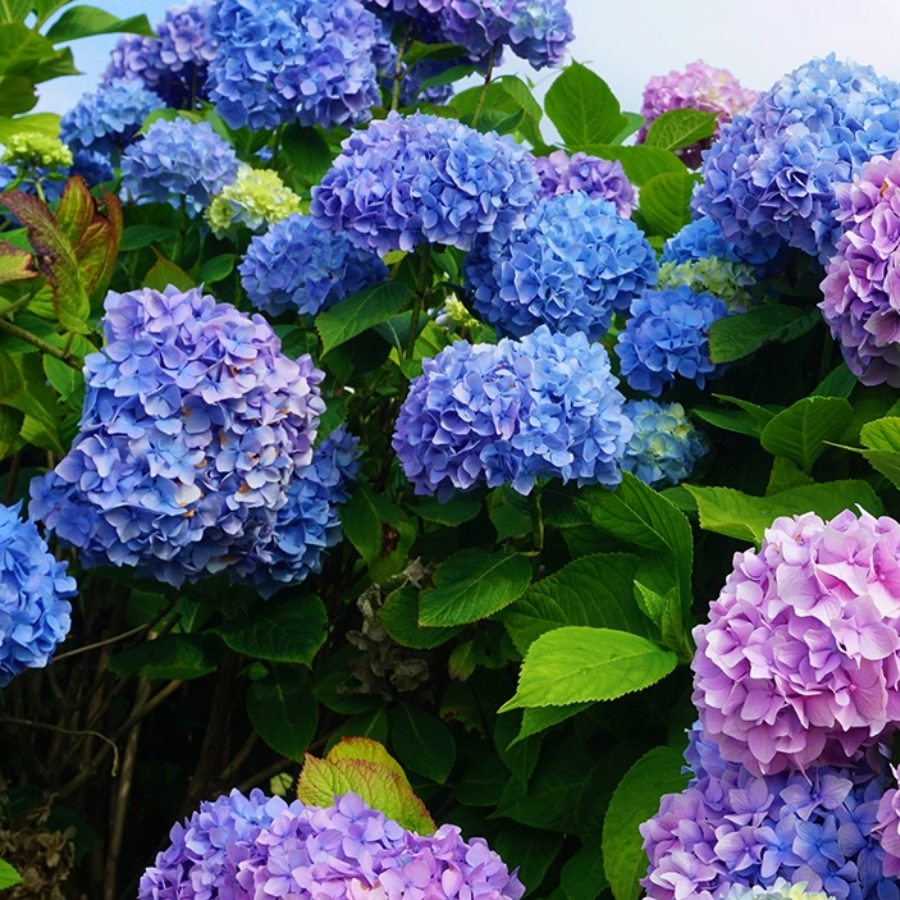 Large, globe-like clusters of vibrant flowers, often changing color with soil pH